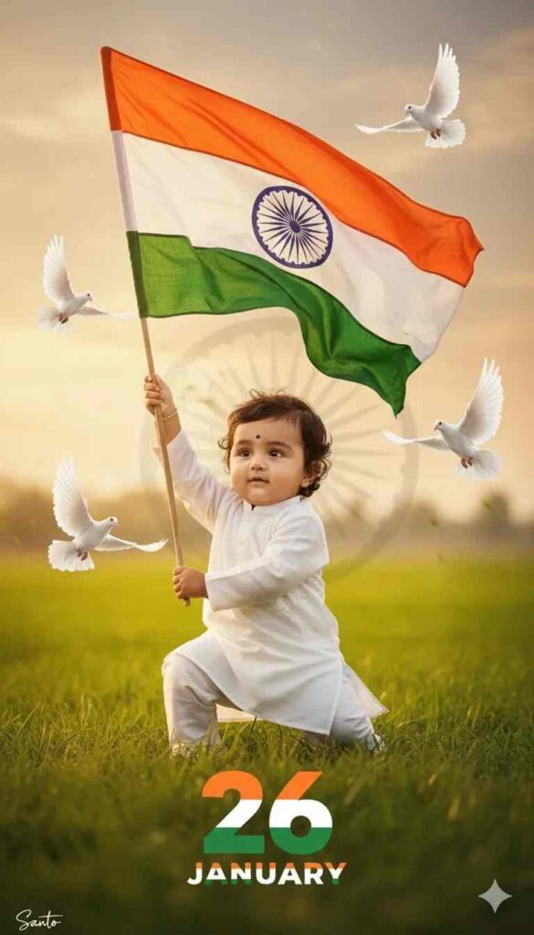 Ultra-realistic patriotic portrait of uploaded Indian kid boy crouching on one knee, holding the Indian tricolor flag.. Green khet and faded Ashoka Chakra in soft background, flying doves, warm golden-hour cinematic lighting, shallow depth of field, 68K DSLR quality. A small Santo signature in left corner, and large 26 number with three indian flag colour, 'JANUARY' in bottom with stylish font and blur.
