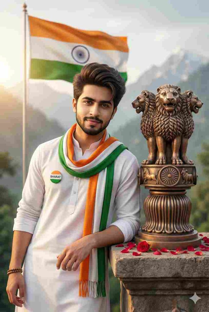 a hyper-realistic cinematic 3d close-up portrait of a young indian man leaning beside the lion capital of ashoka (ashoka stambh), with a confident calm expression, gentle smile, wheatish skin tone, sharp jawline, light trimmed beard, and thick voluminous hair styled upward, looking directly at the camera with proud eyes. he wears a clean white traditional kurta and an indian tricolor scarf draped around his neck, a small round badge reading “bharat,” and a simple beaded bracelet. beside him stands a bronze ashoka stambh on a stone pedestal with rose petals. the background shows a waving indian flag, misty himalayan mountains, golden-hour lighting, shallow depth of field, ultra-realistic textures, cinematic color grading, patriotic and inspirational mood, photorealistic 8k quality.