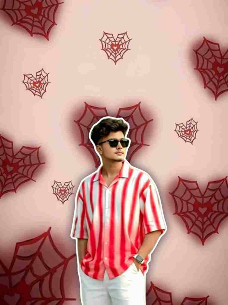 Create using uploaded image A stylish young man taking a mirror selfie, wearing a navy blue loose shirt and white pants, minimal jewelry, curly hair, holding a phone in front of his face. Soft pink background decorated with small red spiderweb hearts, aesthetic modern vibe, soft shadow outline around the person, name “Raj” written in elegant cursive font on the side, clean and realistic portrait, well-lit and trendy Instagram-style edit.