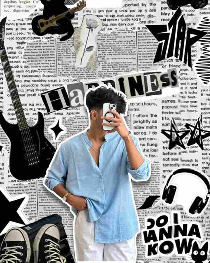 "A stylish young man captured in a mirror selfie, his face obscured by a smartphone with a dark case. He is wearing a slightly oversized, light-colored (off-white/cream) button-up shirt, with one hand casually in his pocket. Minimal accessories are visible, including a red thread on his wrist and a ring. The background is a dynamic collage of black and white elements: newspaper clippings and text, graphic cut-outs of electric guitars, headphones, stars, and bold text overlays like 'HAPPY', 'STAR', and 'DO I WANNA KNOW'. The overall aesthetic is a trendy, urban, and artistic vibe with a grunge or pop-art influence, maintaining the original image's aspect ratio.