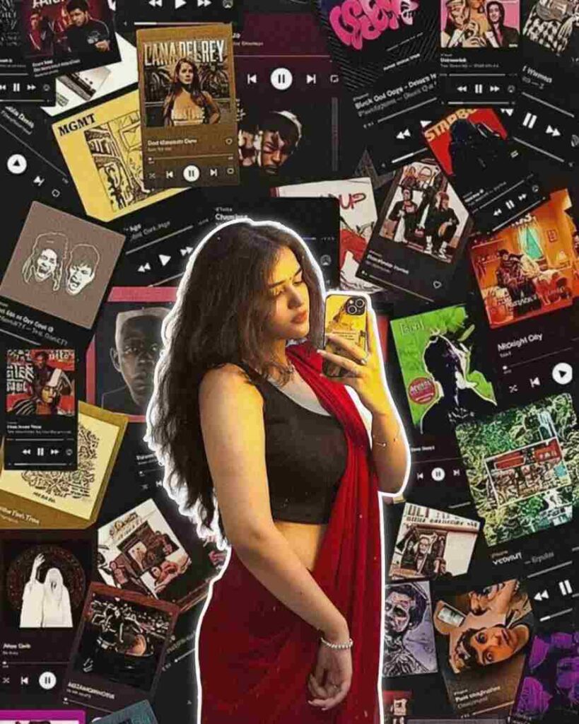 A woman with long, dark hair, wearing a black crop top and a red sari, is taking a selfie with a yellow phone. She is positioned against a background that is a collage of various album covers and music-related graphics, giving the impression of a digital or musical theme.