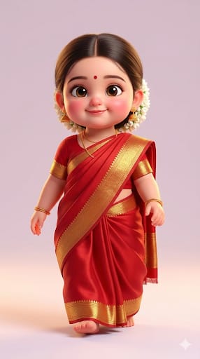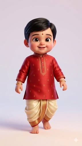 Ultra-cute Indian baby boy, age 2–3, chubby cheeks, soft round face, smooth fair-to-warm skin tone, big expressive innocent eyes, joyful smiling expression. Hairstyle: Neatly combed short hair, side parting, clean and well-groomed, natural black hair texture, smart and traditional look. Outfit: Traditional Red Silk Kurta with subtle gold embroidery, matching Cream or Gold Silk Dhoti (Veshti) with rich zari border, elegant ethnic baby boy look. Accessories: Thin gold chain, small gold bracelets (kada) on wrists, traditional sandalwood or kumkum tilak on forehead, minimal and baby-safe. Pose & Action: Gentle toddler movement, standing calmly or taking a slow playful step, joyful and innocent expression. Style: High-quality 3D Pixar / Disney-inspired baby realism, ultra-soft skin texture, rounded proportions, adorable character design. Environment: Clean soft studio background with light pastel gradient, no objects, no clutter. Lighting: Soft cinematic studio lighting, warm tones, gentle highlights, smooth shadows, subtle depth. Camera: Slightly low-angle view, full body visible head-to-toe, centered framing, portrait 9:16. Quality: Ultra-high resolution, wholesome, adorable, cinematic, no text, no watermark, no logo.