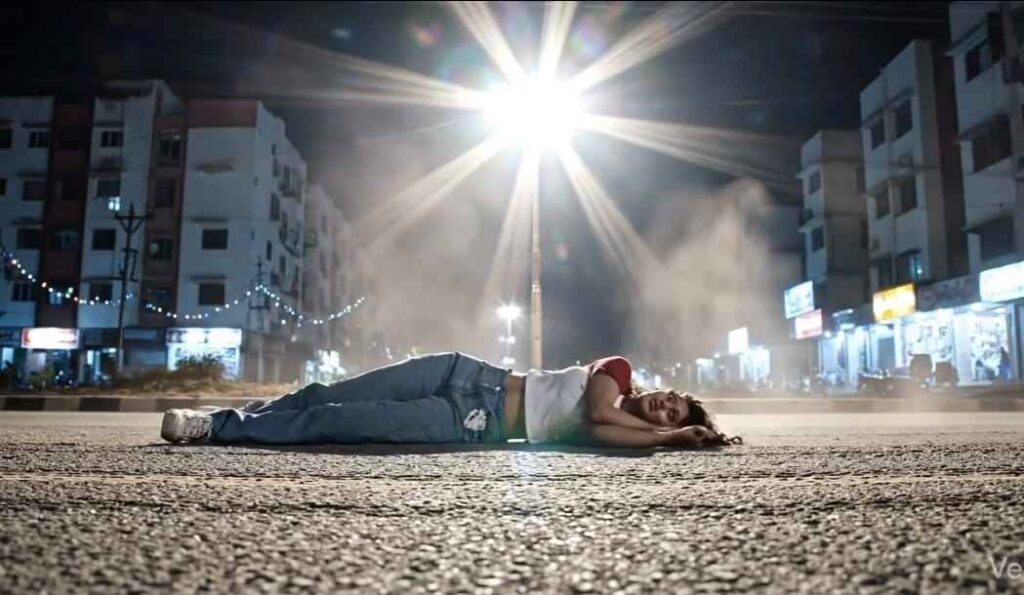 Night time cinematic scene filmed from a fixed extreme low-angle SIDE VIEW camera placed directly on an Indian asphalt road. The camera is positioned only left-to-right movement. perpendicular to the road, capturing Strictly side profile view only. No front-facing or head-on shots. "Environment Rough Indian road texture with dust and tire marks. A harsh white Indian streetlight behind the scene creates strong starburst lens flares. Dim Indian apartment buildings, shop lights, and decorative LEDs glow softly in the background Start Scene A quiet Indian street at night. The camera remains static and low. Truck Movement (side Profile Only) A large Indian commercial truck (tata /Ashok Leyland style), dull brown-orange with yellow reflective strips, moves from left to right across the frame. Wheels show motion blur Suspension movement visible Dust and wind move horizontally Camera does not pan or rotate Human Motion (IMPLIED, NOT EXPLICIT) As the truck passes the centre of the frame, a human figure from the reference image appears to lose balance near the rear. The figure moves suddenly into the frame from the truck's side Momentum carries the body forward and downward Natural gravity-driven fall with realistic physics Contact with the road is suggested through motion, dust, and body positioning A short forward slide follows, slowing naturally Final Position The figure comes to rest matching the reference image: -Face-down Stretched out Dark clothing with subtle red accents Fully visible in side profile End Shot The truck exits frame to the right. The camera holds on the still figure under the harsh streetlight. Cold night tones, gritty realism grounded Indian street atmosphere. Cinematic, but restrained and realistic.