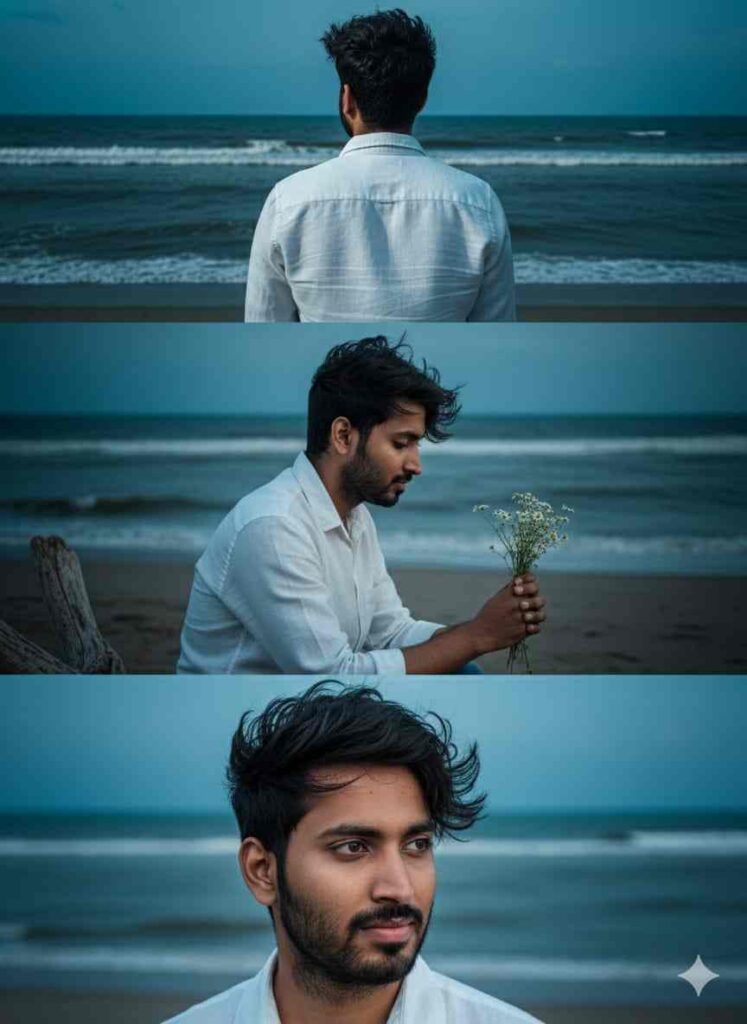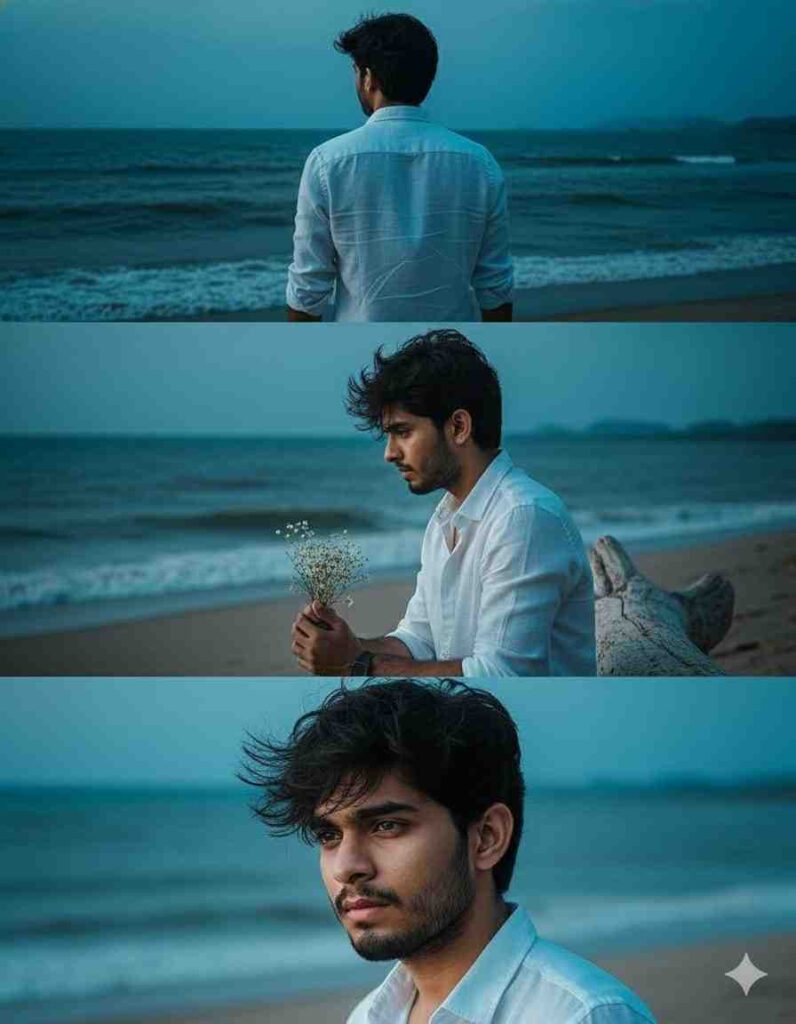 A split image showing three panels. The subject is a young, attractive man from reference photo with dark, messy hair, wearing a white button-down shirt on a beach at dusk. Panel 1 (Top): From behind, showing him looking out at the dark ocean. Panel 2 (Middle): Side profile, holding a small bouquet of white flowers, looking down Panel 3 (Bottom): Close-up of his face high detail, moody lighting, intense gaze wind-blown hair. Cinematic, deep blue and teal tones, dramatic lighting